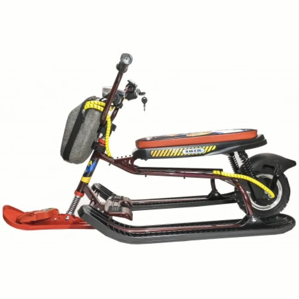 При мощности электромотора в 400 Вт способен разогнаться до 20 км/час. Зарядки батареи хватает на 2-3 часа или дистанцию до 15 км пути. При весе 14 кг электроснегокат способен выдержать нагрузку взрослого пользователя до 100 кг. Модель оснащена компактными эргономичными лыжами и фирменной тормозной системой, благодаря которым даже при максимальном разгоне производитель гарантирует высокую степень безопасности, минимальные риски заносов. Для заказа модели по разумной цене сейчас предлагаем позвонить оператору нашего интернет-магазина.