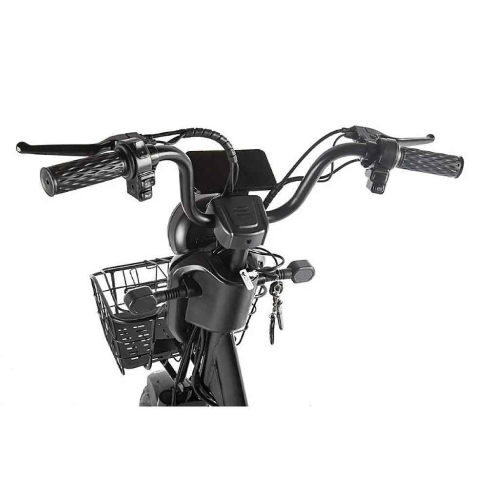 Мощность двигателя составляет 350 Вт, достаточная для развития скорости 25 км/час. Удобство и комфорт езды обеспечены мягким вместительным сиденьем, рассчитанным на двоих. Повторяя анатомические части тела материал изготовления и конструкционные особенности сиденья снижают нагрузку на позвоночник, снимают утомление.