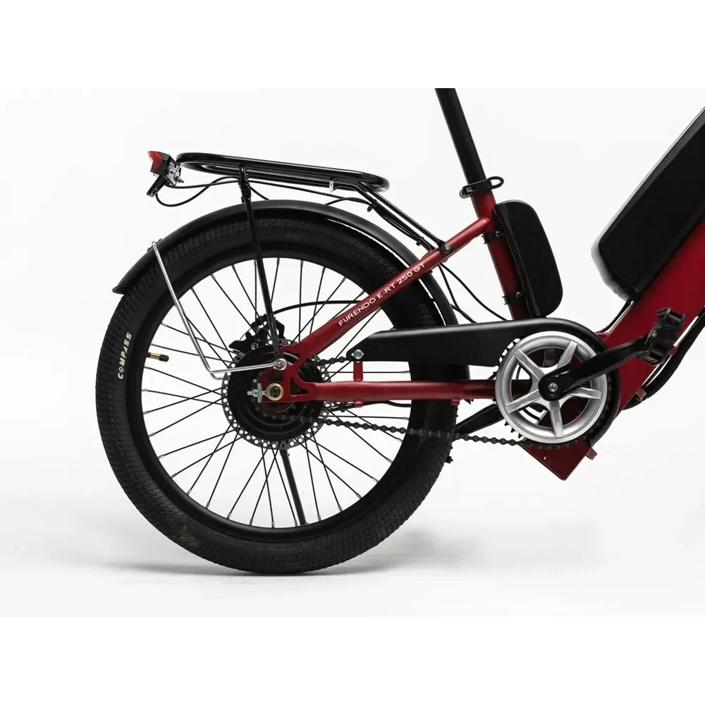 Максимальная нагрузка электровелосипеда FURENDO E-RT 250 GT - 120 килограмм, а без подзарядки он сможет преодолеть расстояние до 45 километров. Плавный ход обеспечивают 20-дюймовые колеса.