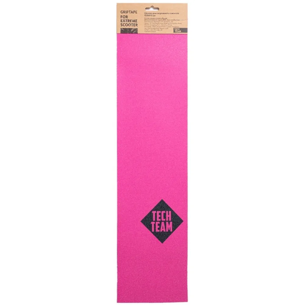 Модель Пинк (Pink) с крупным зерном выполнена из долговечного материала и имеет хорошую клейкую поверхность. Дизайн гриптейпа хоть и простой, так как он монотонный с нанесённым логотипом Tech Team, но при этом яркий и выделяющийся. Такой цвет только подчеркнёт стиль самоката и вкус его пользователя. Размер шкурки – 153х610 мм, поэтому она отлично подойдёт на большинство самокатов.
